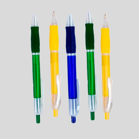 Clásico bolígrafo con mecanismo de pulsador, de atrevido diseño bicolor y cuerpo en colores frosted de suave acabado. Con cómoda empuñadura a juego. Tinta azul